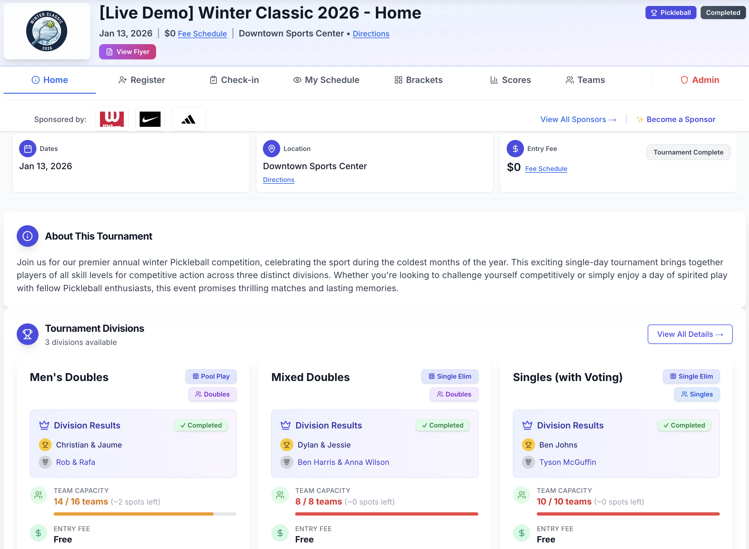 QR check-in, automated seeding, real-time scoring. Everything updates live for players and spectators.